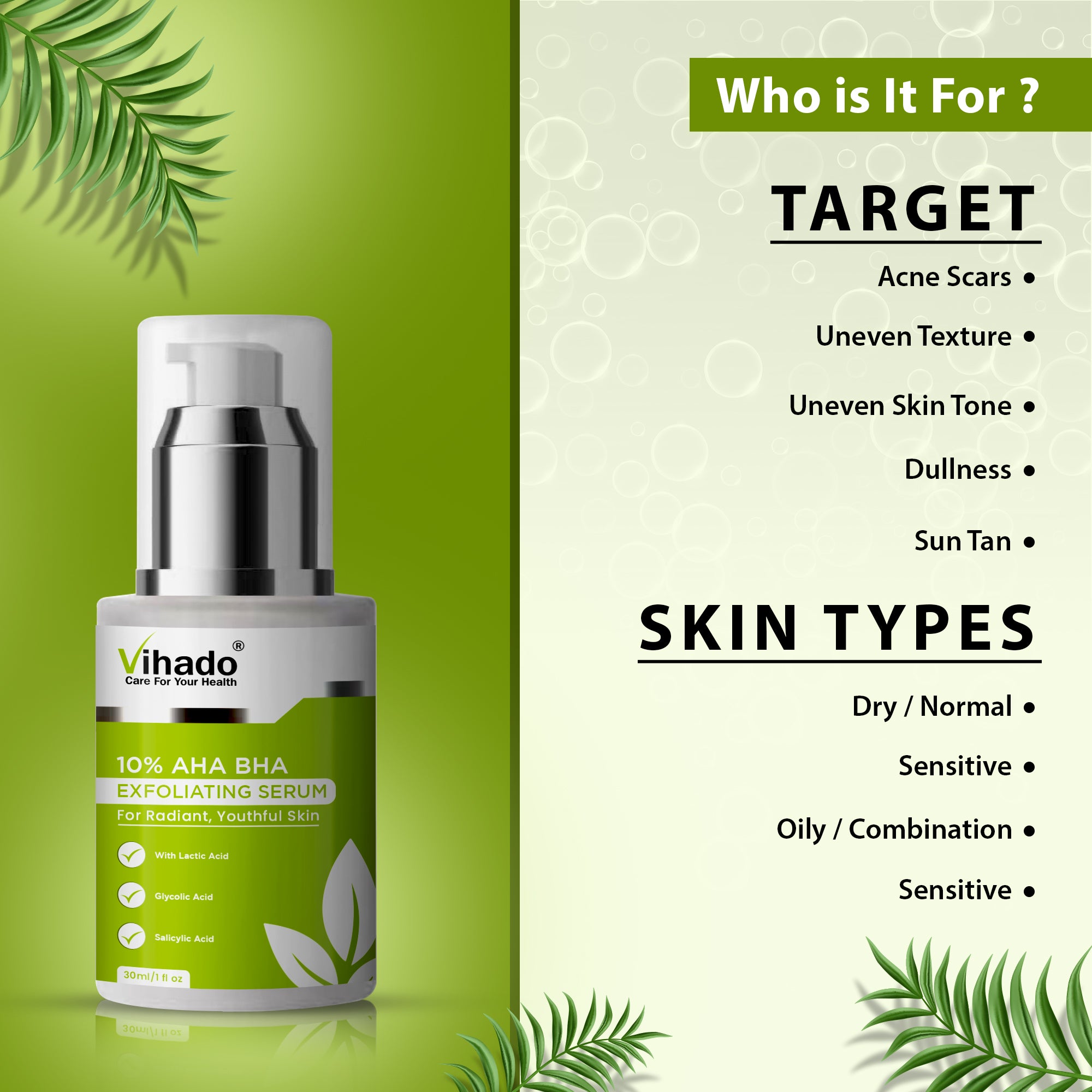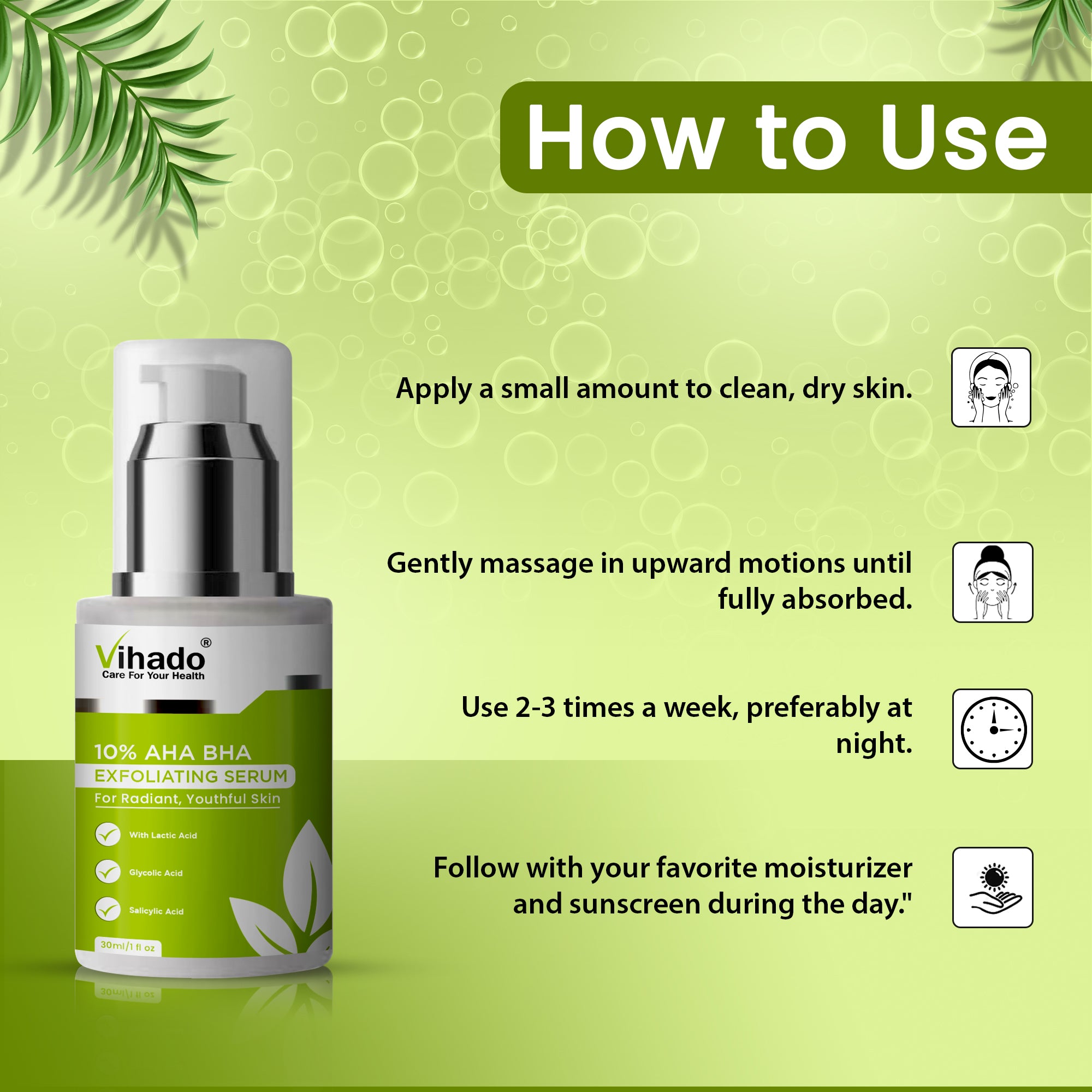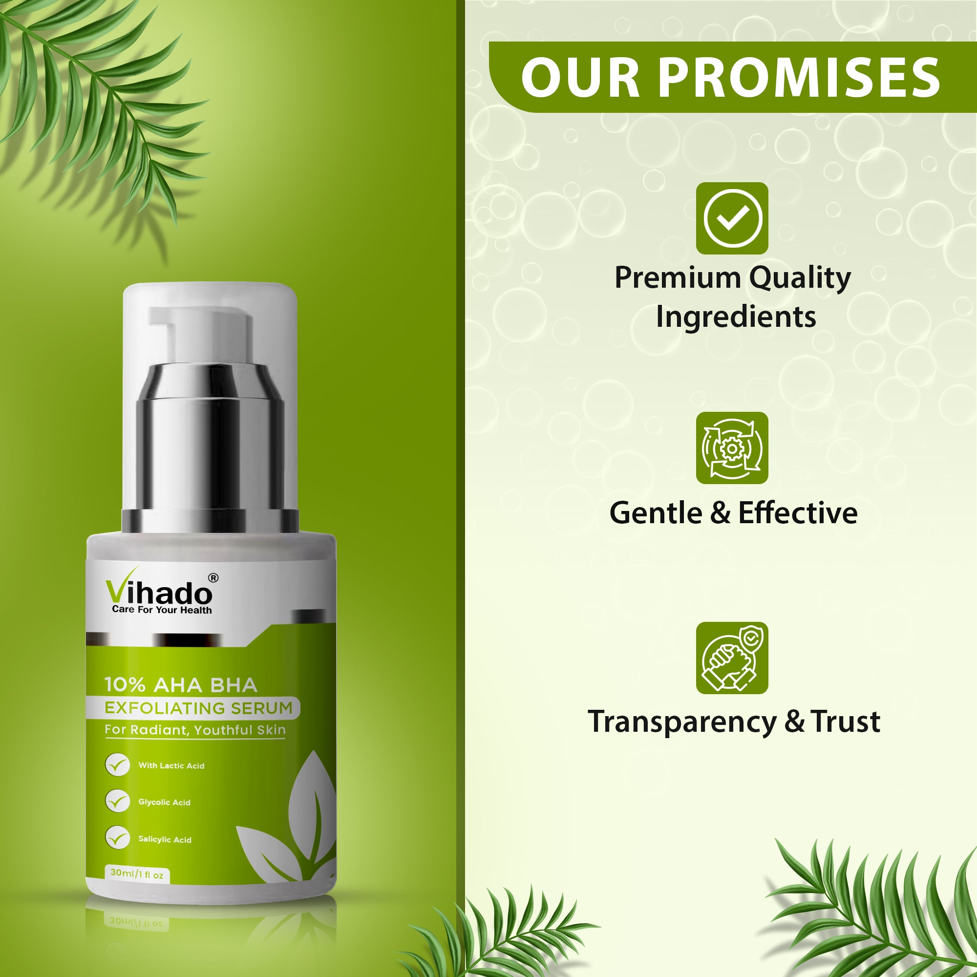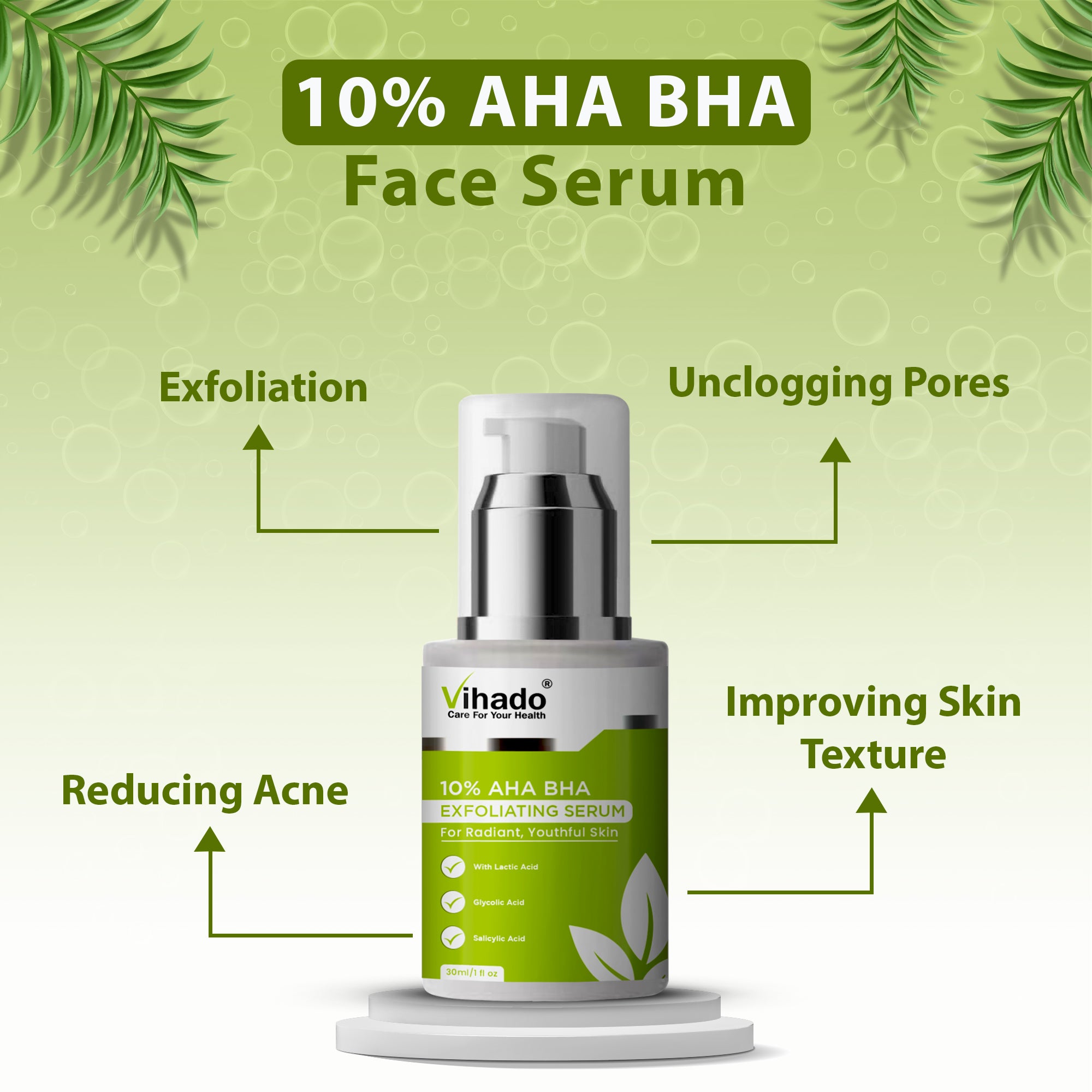 Transform your skincare routine with Vihado 10% AHA + BHA Exfoliating Serum. Experience the confidence that comes with clear, radiant, and youthful-looking skin. Shop now and unlock the secret to a glowing complexion!