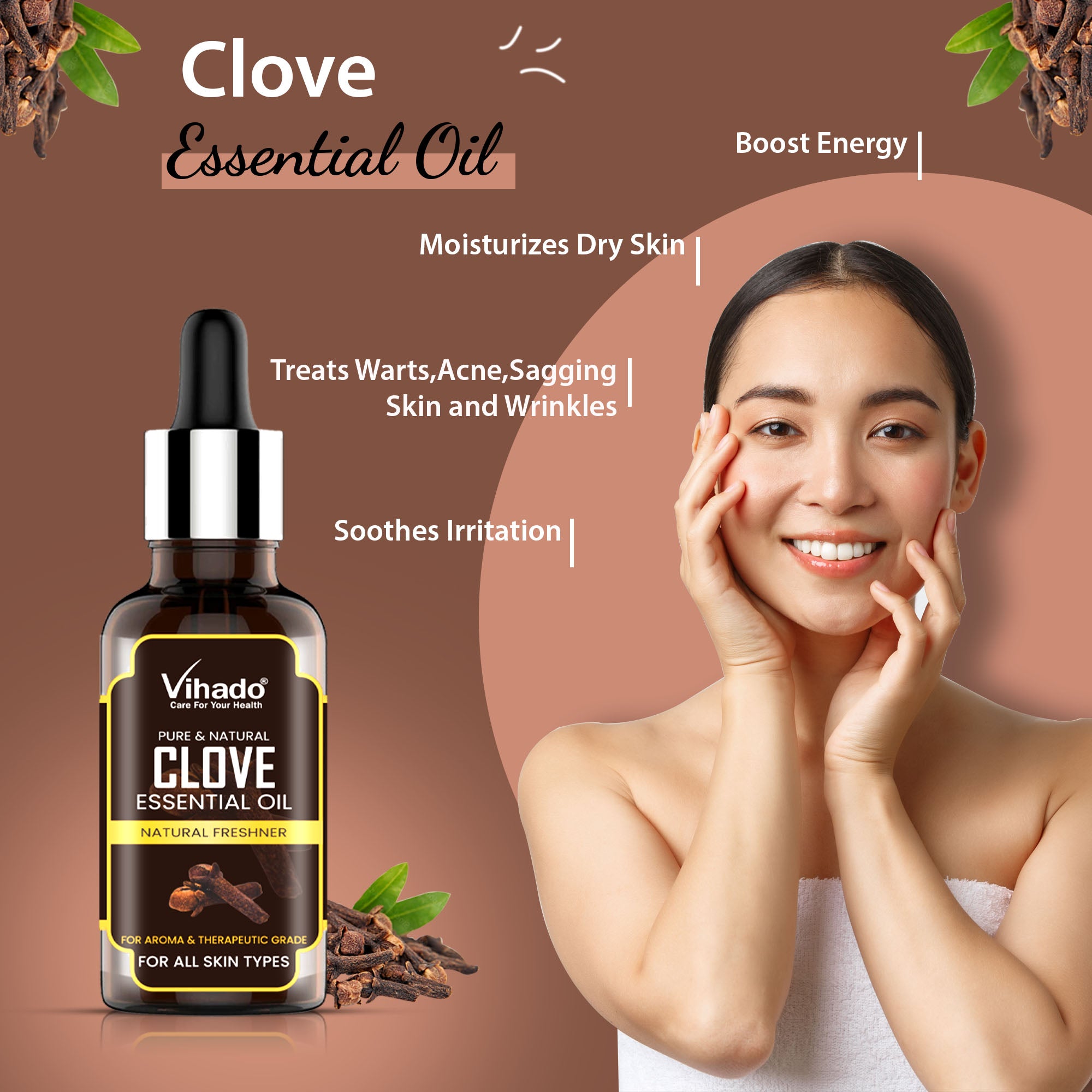Got acne? Clove oil can help. It’s got antibacterial, antiseptic properties that disinfect acne prone skin and fight off acne causing bacteria.
