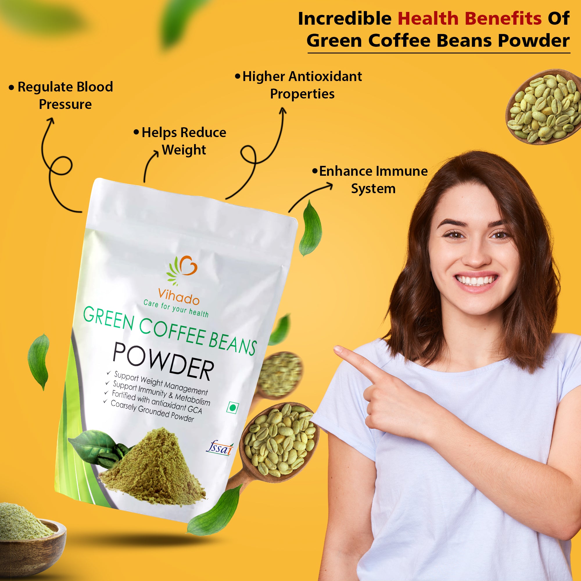 Vihado Green Coffee Beans Powder comes from the organic cultivated farms and prepared for use under a very mild treatment in a very special way to preserve the vital ingredients. It is use for prepare the coffee drink as a result which supports weight loss.