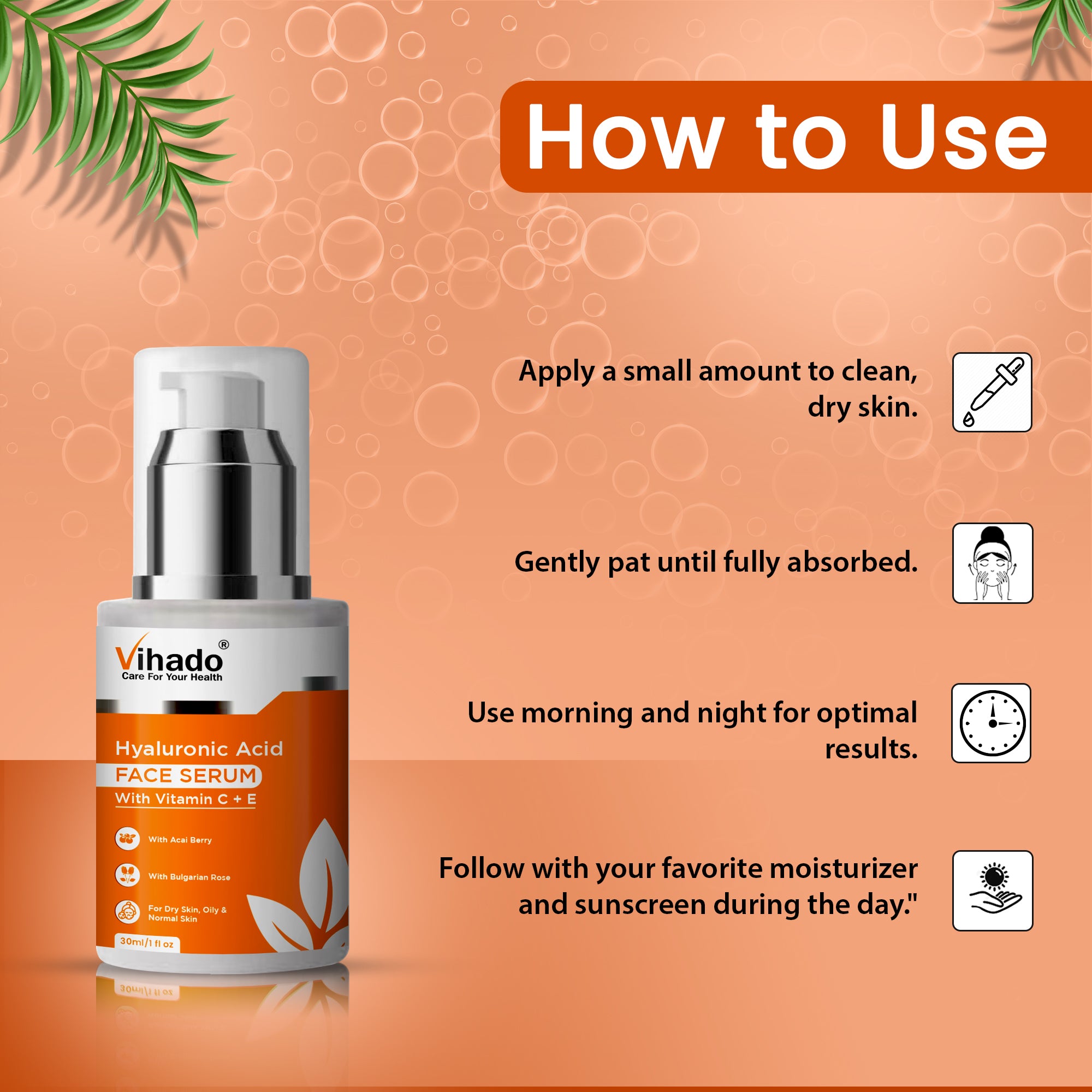 Optimize your skincare routine with Vihado Hyaluronic Acid Face Serum. Get ready to reveal your most radiant, youthful skin yet!