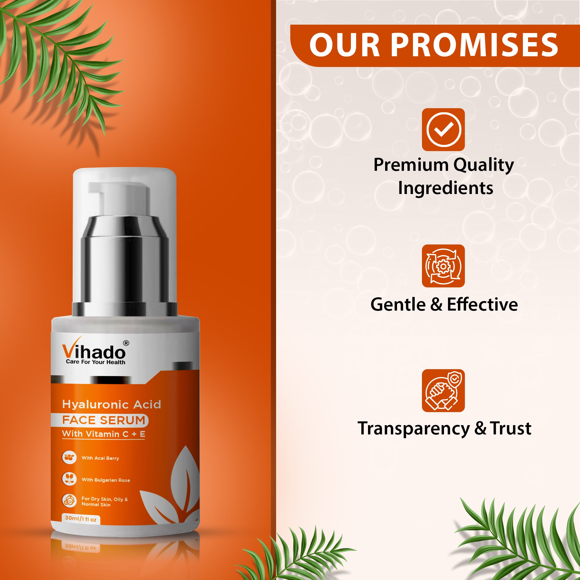 Unlock the secret to plump, hydrated, and glowing skin with Vihado Hyaluronic Acid Face Serum. This advanced skincare solution is designed to deliver intense hydration, reduce fine lines, and restore youthful radiance. Formulated with pure hyaluronic acid, our serum penetrates deep into the skin, providing long-lasting moisture and a visibly smoother complexion.